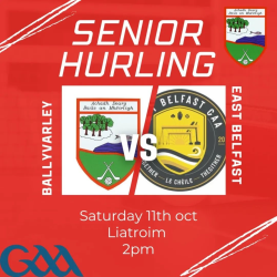 Good luck to our senior hurlers tomorrow as they take on East Belfast in the Junior championship.